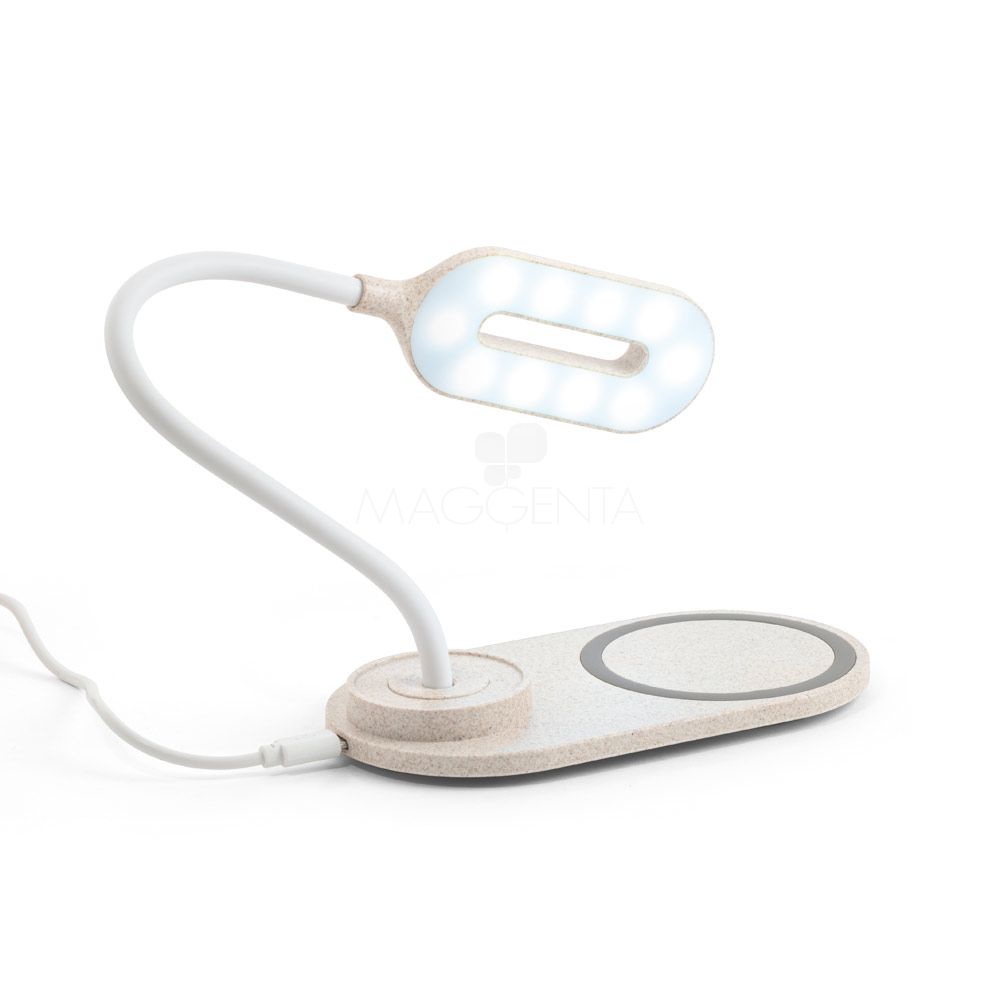 Luminária LED de mesa em ABS e fibra de palha de trigo com carregador wireless. A haste é flexível para ajustar a direção da luz e contém 20 LEDs que permitem uma iluminação até 3 níveis de intensidade. No topo da luminária encontra-se um botão touch para ligar, desligar e ajustar os níveis de iluminação. O carregador sem fios é de carregamento rápido, tendo uma potência até 10W, com entradas 5V/2A e 9V/1.67A. No local onde o equipamento é colocado tem um círculo com silicone para evitar que se mova. Incluso cabo micro USB de 1 m. Ideal para brindes promocionais e eventos corporativos. Imagem ilustrativa.