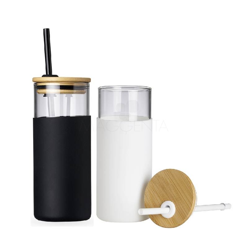 Copo de vidro com capa protetora de silicone, tampa de Bambu e canudo de silicone. Capacidade de 450ml.