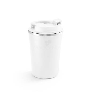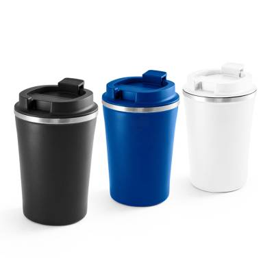 Copo de viagem em aço inox e PP com parede dupla e isolamento a vácuo. Acabamento mate e revestimento em pó que lhe confere mais durabilidade e resistência. Tem capacidade até 470ml.