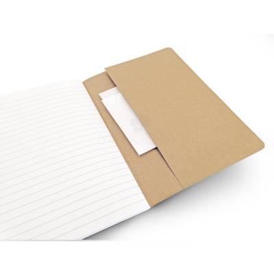 Caderno A5 com 40 folhas pautadas de papel reciclado e capa em cartão com bolso interior.