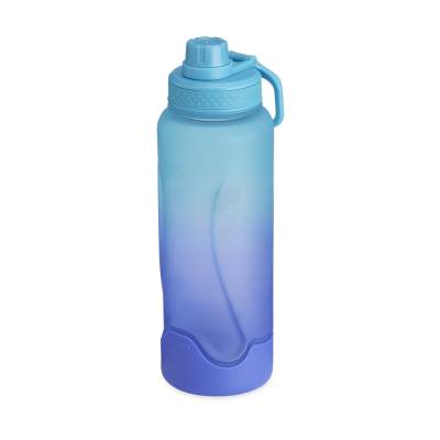Garrafa plástica 1,1 litros com base de silicone anti-impacto (removível). Tampa com alça para transporte e tampa de proteção para o bocal.