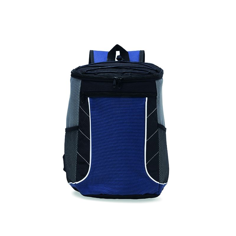 Bolsa térmica personalizada de poliéster. Possui dois compartimentos e capacidade de 18 litros. A bolsa possui revestimento térmico em PEVA atóxico, bolsos laterais telados, alça de mão e alça para as costas com revestimento espumado.