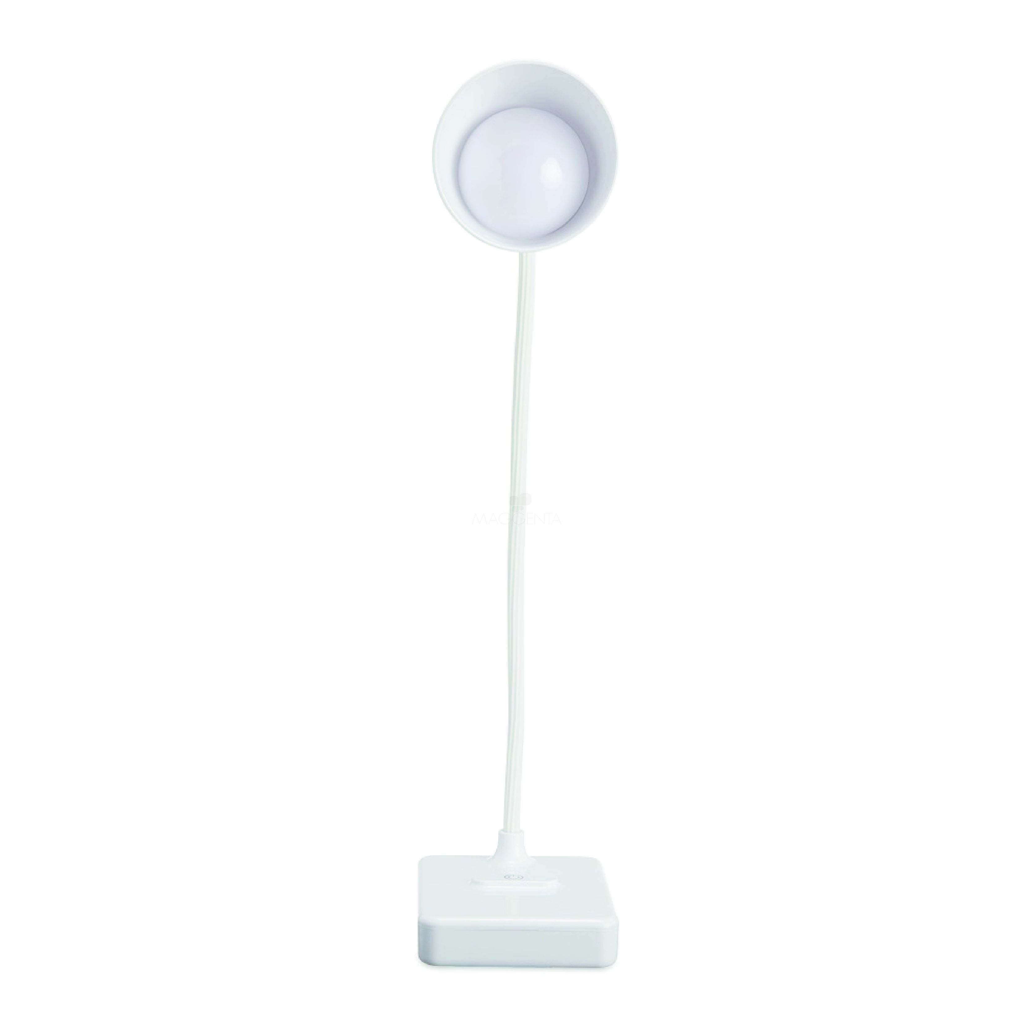 Luminária plástica touch articulável com suporte para celular. Contém três tipos de iluminação: luz branca (fria), luz de descanso (amarela), e luz forte (junção da luz branca com a amarela). O produto possui bateria interna e acompanha cabo USB.
