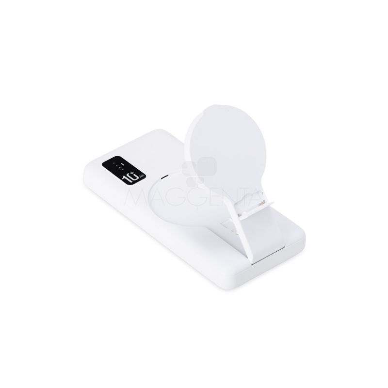 Carregador portátil plástico via indução ou via cabo com 10.000mAh e indicador led de bateria. Com suporte inclinável para o carregamento via indução, o power bank possui duas portas de saídas USB, possibilitando o carregamento de dois dispositivos simultaneamente. Contém porta de entrada tipo-C, V8 e acompanha cabo USB.
