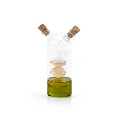 Galheteiro em vidro que contém dois reservatórios com capacidades de até 50 ml e de até 250 ml. O galheteiro contém duas rolhas de cortiça. Fornecido em caixa presente.