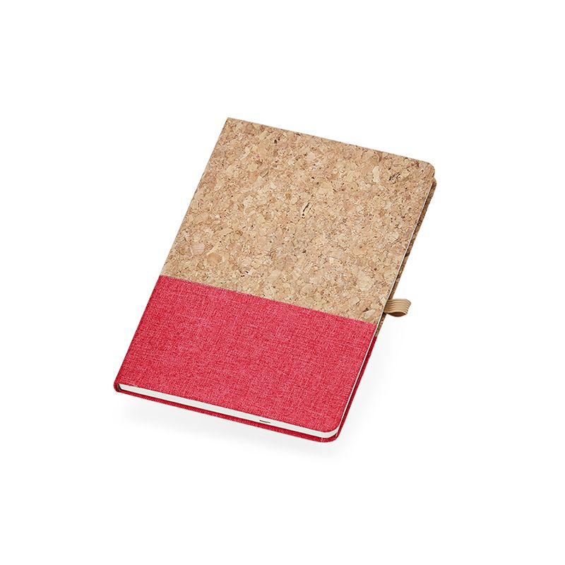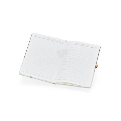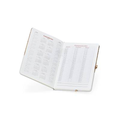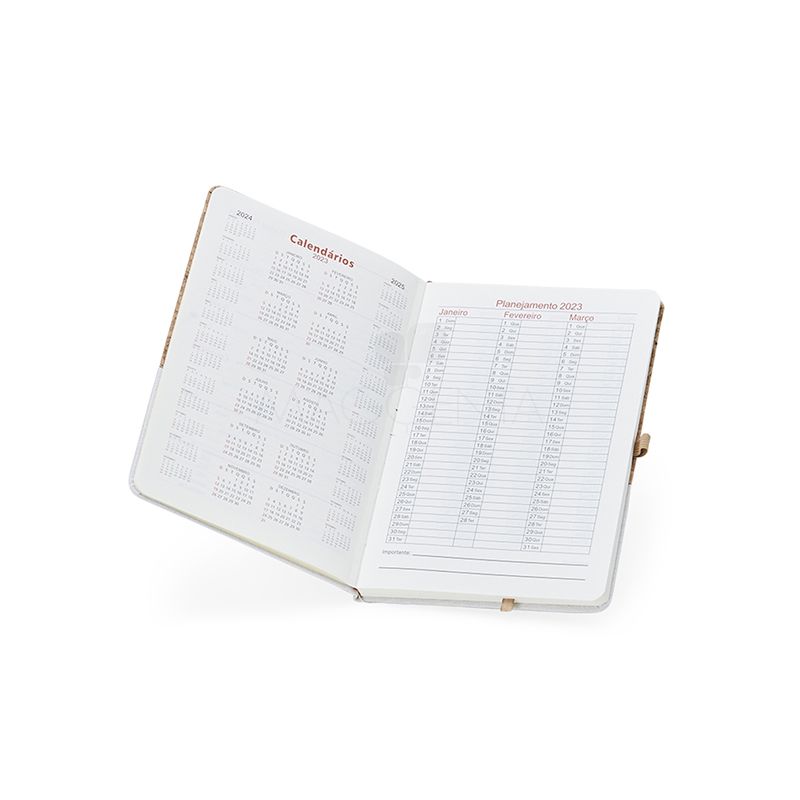 Bloco de anotações personalizado produzido cortiça com detalhe em linho, possui capa dura, marcador de página com fita de cetim, suporte para caneta, folhas pautadas, possui campo para data; dia da semana e condição climática, página para dados pessoais, calendário 2023 a 2025 e por fim, folhas para planejamento anual.