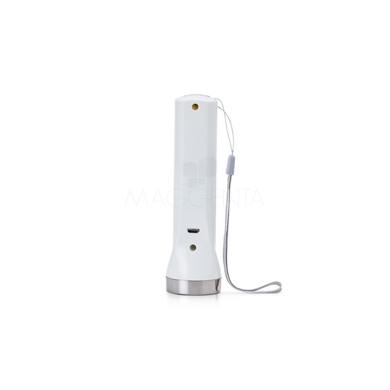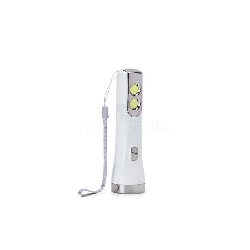 Lanterna plástica recarregável personalizada, com um LED com 3 estágios de iluminação e dois LED laterais com função luminária. Possui cordão de nylon para transporte e acompanha cabo USB. Ideal para divulgar sua empresa em eventos corporativos, brindes personalizados e campanhas promocionais.