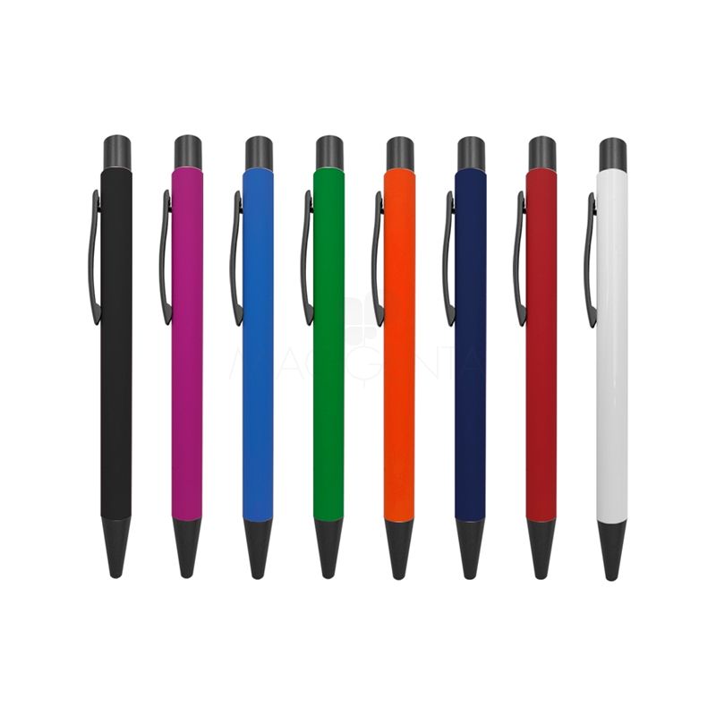 Caneta em metal personalizada, possui acabamento emborrachado, porém na cor branca não é emborrachada. Seu design é cilíndrico, acabamento fosco e acionamento por clique. Ideal para divulgar sua empresa em eventos corporativos, brindes personalizados e campanhas promocionais.