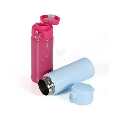 Squeeze garrafa personalizada produzido em metal inox, com capacidade de até 400 ml e tampa plástica atóxica rosqueável e anel de vedação em silicone para evitar vazamento, sistema de abertura automática com acionamento por botão frontal e trava de segurança para evitar que abra acidentalmente.