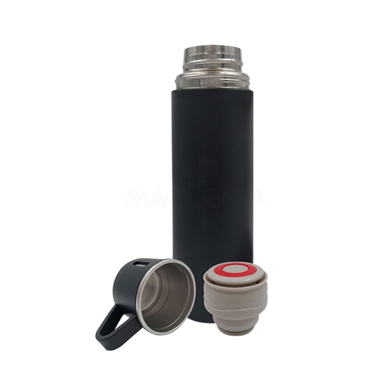 Garrafa térmica personalizada em metal com parede dupla e com pintura texturizada, tampa com clique para abertura feita em plástico com silicone e três xícaras em metal com acabamento em plástico que são rosqueáveis na garrafa. Ideal para divulgar sua empresa em eventos corporativos, brindes personalizados e campanhas promocionais.