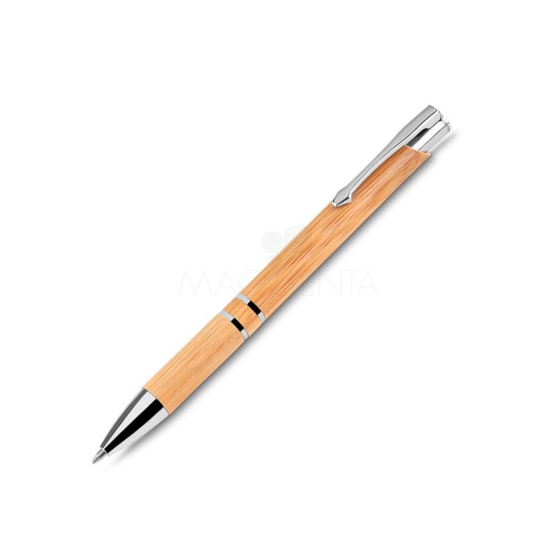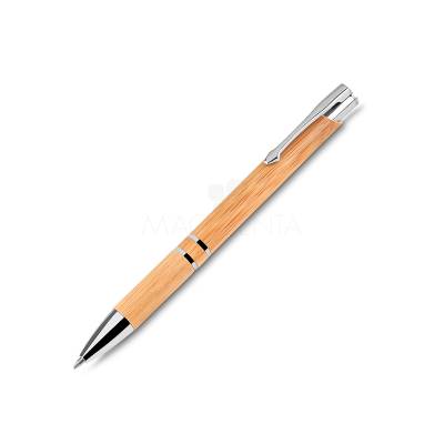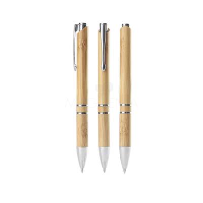 Caneta de bambu personalizada com click e ponteira de fibra de trigo / ABS. Possui esferográfica azul e acionamento da escrita por click. Acompanha estojo de papel impresso com imitação em bambu. Ideal para divulgar sua empresa em eventos corporativos, brindes personalizados e campanhas promocionais.