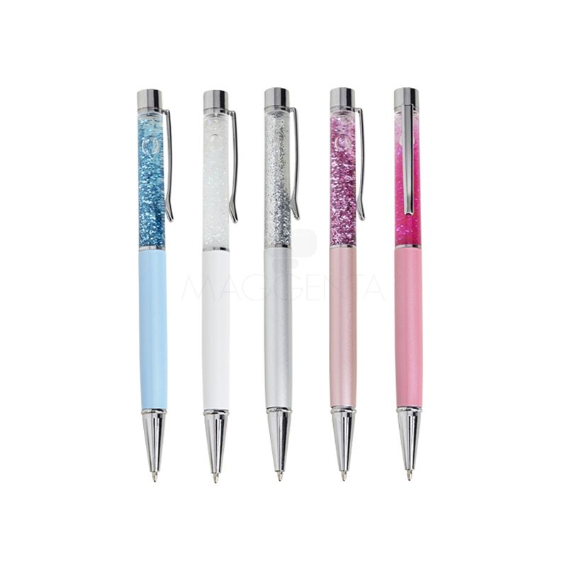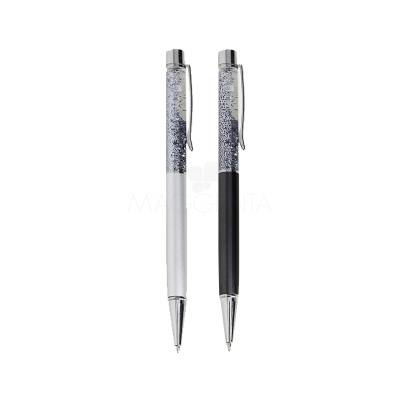 Caneta de metal personalizada com detalhes brilhantes, com um design inovador e elegante. Possui um acabamento diferenciado onde o charme da caneta são pequenas réplicas de diamante em seu corpo além de possuir uma escrita macia e confortável. Ótima opção para brindes promocionais e eventos corporativos. O acionamento da ponteira é feito através do sistema giratório na parte inferior.