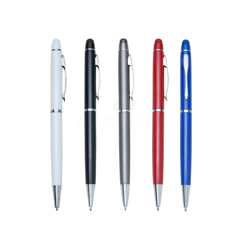 Caneta de metal personalizada com ponteira touch, clip e anel cromado e esferográfica cor azul com acionamento por giro. Imagem ilustrativa. Ideal para brindes promocionais e eventos corporativos.