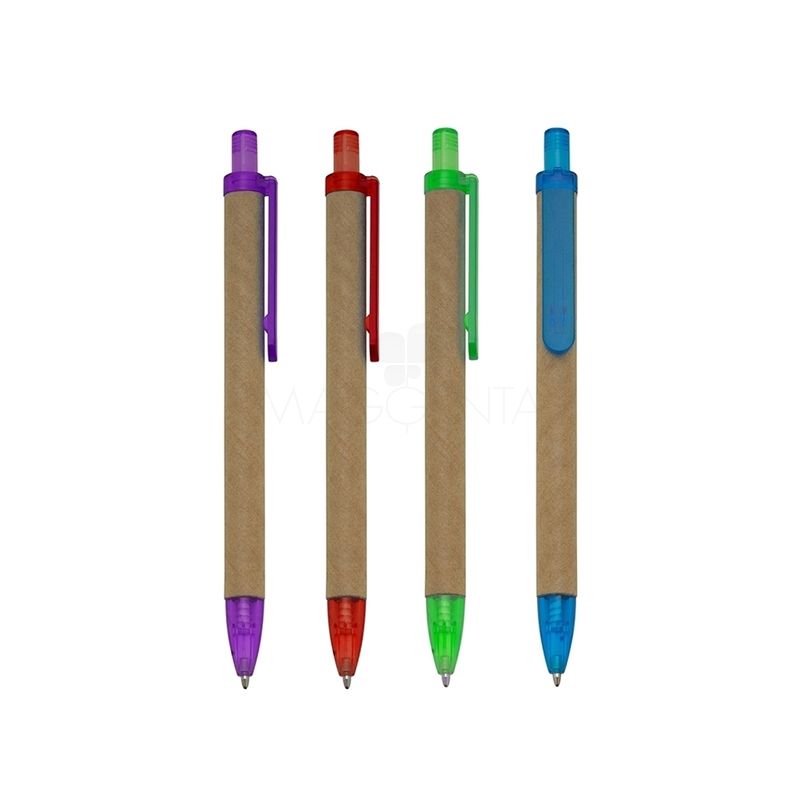 Caneta ecológica personalizada produzida em 100% papel reciclado, possui detalhes em plástico translúcido, acionamento da escrita por click e esferográfica na cor azul. ideal para brindes promocionais e eventos corporativos.