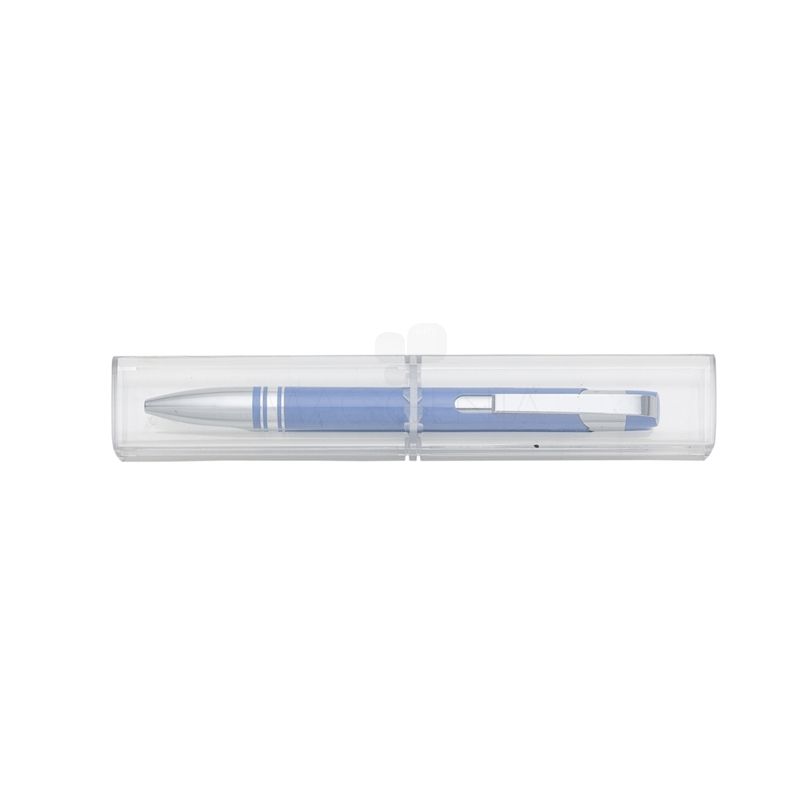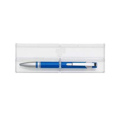 Conjunto caneta com estojo de acrílico. Caneta semi metálica com carga esferográfica azul e acionamento por clique. Ideal pra brindes personalizados e eventos corporativos.
