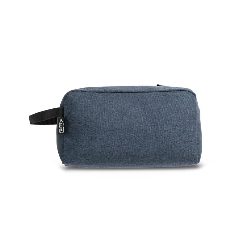 Nécessaire personalizada produzida em rPET 600D com interior forrado. Possui bolso frontal com zíper e alça lateral em webbing. Ideal para brindes promocionais e eventos corporativos.