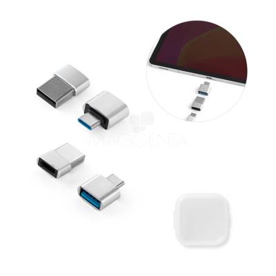 Conjunto de adaptadores em alumínio composto por 1 adaptador de USB-A para USB-C e 1 adaptador de USB-C para USB-A. Tecnologia USB 2.0. Fornecido em caixa individual em PP.