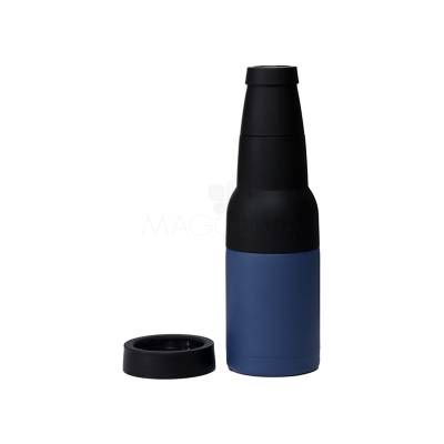 Copo térmico multiuso em inox e plástico personalizado, pode ser usado como porta long neck ou porta lata e possui abridor de garrafa. Ideal para brindes promocionais e eventos corporativos.