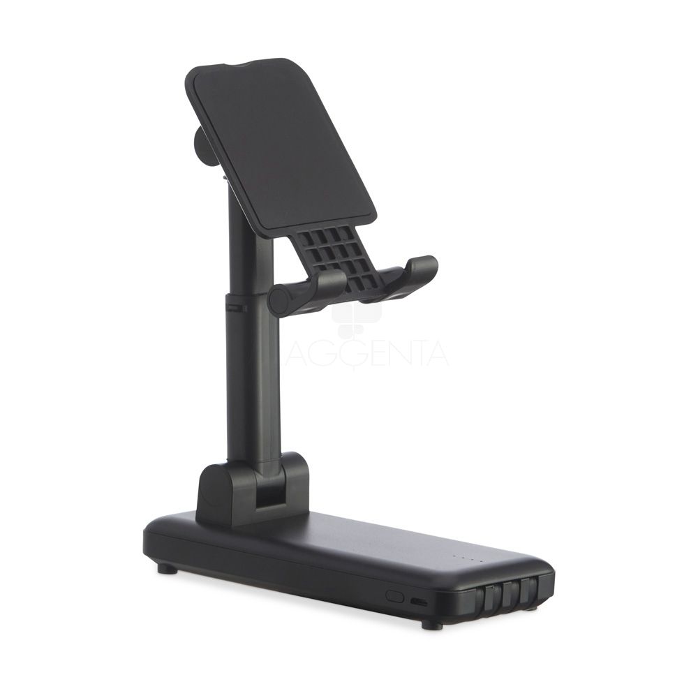 Power bank 10.000mAh multisaídas com suporte personalizado, portátil com uma base de carregamento em que permite simultaneamente ser usada como um carregador e um porta celular com regulagem de altura e ângulo e tendo ainda a base antiderrapante. É um objeto de design arrojado e dadas as suas características técnicas pode ser usado em viagens (como bateria portátil). Bateria com indicador de carga LED, possibilita o carregamento de até 2 dispositivos em simultâneo, com entrada micro USB e saídas tipo-C, lightning, V8 e micro USB. Capacidade de 10.000 mAh. Fornecida em caixa presente com cabo incluso. Tendo a parte externa confeccionada em plástico resistente, podendo personalizar com o seu logo e trazer destaque a sua empresa. O carregador ideal para brindes corporativos e eventos promocionais.