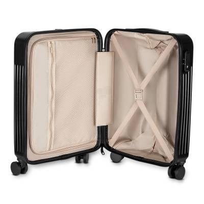 Mala de viagem em ABS Abertura frontal com ziper para acesso ao interior da mala; Saida USB ideal para carregamento de smartphones; Sistema de carrinho de aço; Alça de mão na parte superior Quatro rodas de 360 graus; Acompanha Plaquinha de acrílico auto colante.