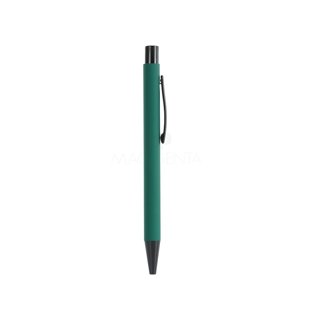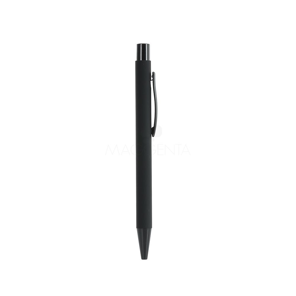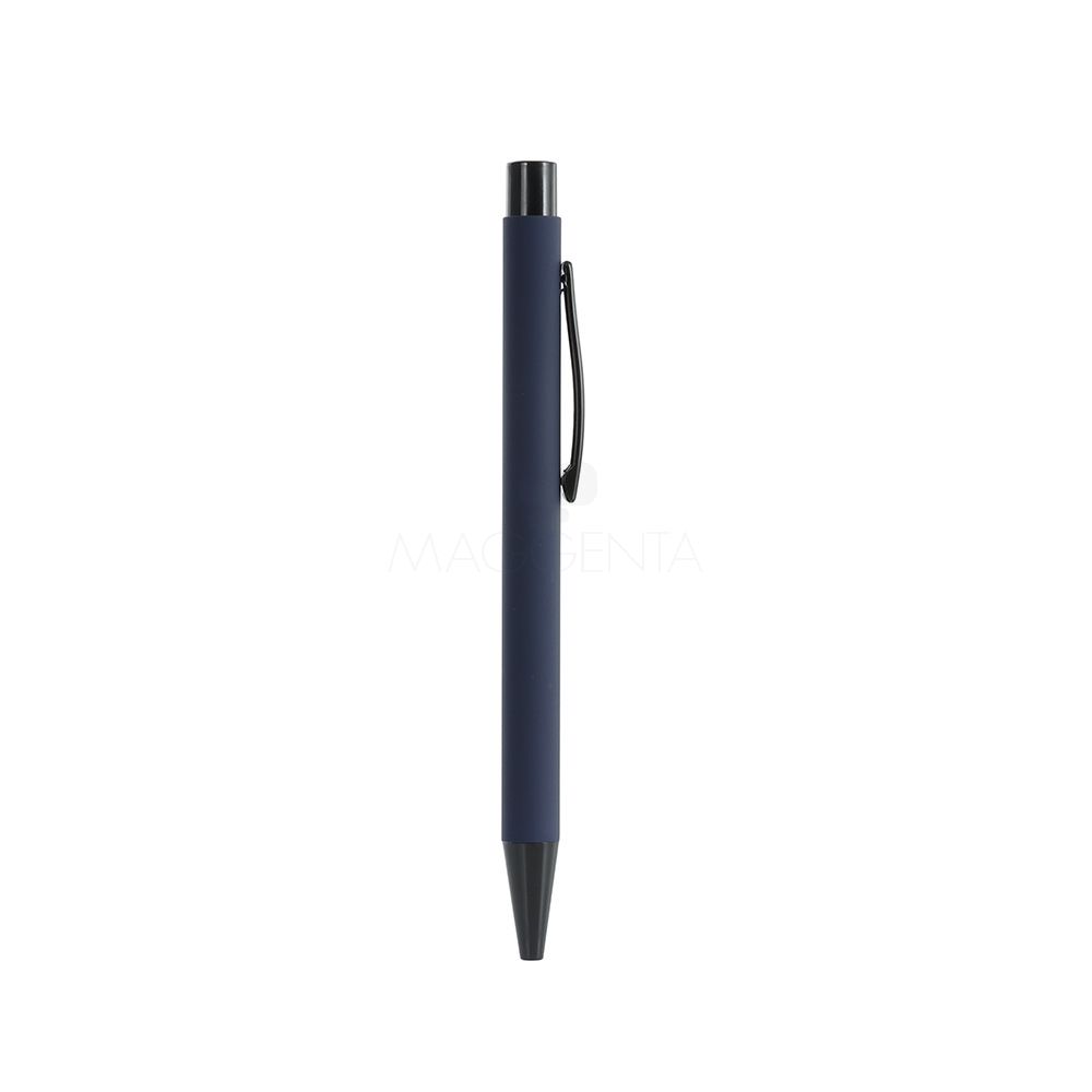 Caneta metálica com acabamento emborrachado, carga esferográfica azul 1.0mm e acionamento por clique.