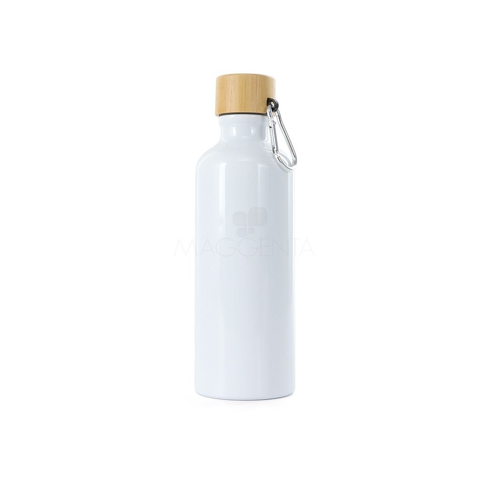 Garrafa de alumínio com capacidade de 500ml. Possui tampa de bambu e acompanha mosquetão de alumínio.