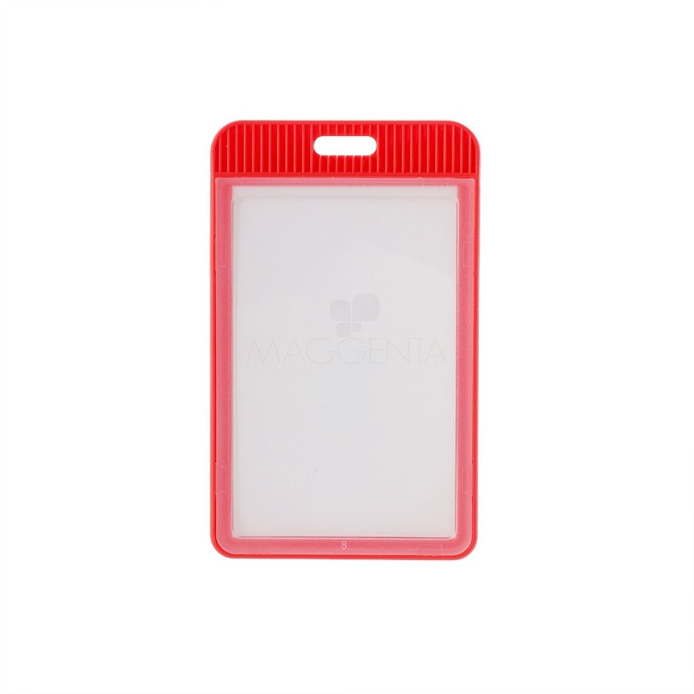 Porta crachá ou porta credencial em plástico resistente. Suporte com visor transparente removível e abertura superior para prender o cordão.