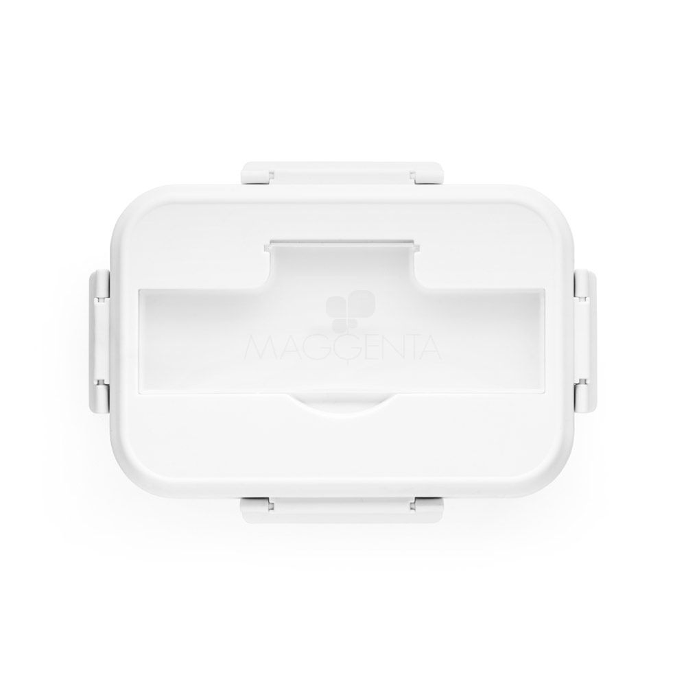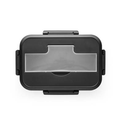 Marmita em PP com capacidade até 1 L. A tampa tem um compartimento para talheres (inclusos). A caixa é apta para micro-ondas, sendo necessário retirar a tampa. Não aconselhável para líquidos.