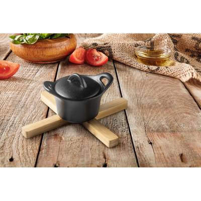 Descanso de panela dobrável em bambu. Fornecido em caixa oferta em papel kraft.