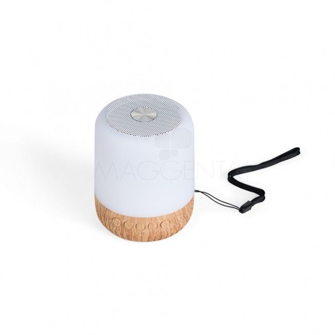 Caixa de som multimídia com luzes, material plástico. Operante nos modos Bluetooth, rádio FM, pen drive e cartão TF (MicroSD). Base antiderrapante. Acompanha cabo USB e cordão de nylon.