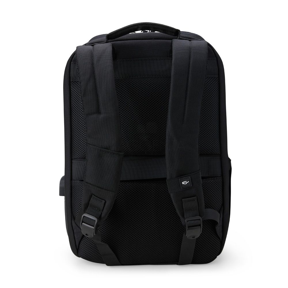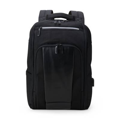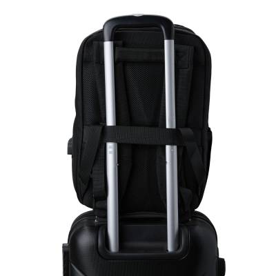 Mochila confeccionada em Nylon 23 litros com detalhes em couro sintético. Contém 5 compartimentos, sendo um bolso com faixa refletiva, divisórias internas para acessórios, bolso para tablet e notebook 15.6, bolso antifurto nas costas, bolso externo na lateral com elástico, suporte externo USB, alça para encaixe em malas de viagem, alças da mochila possuem bolsos integrados para suporte de óculos e cartões.