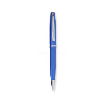 Conjunto de caneta e lapiseira metálicas em estojo metal. Caneta e lapiseira possuem acabamento brilhante, carga esferográfica azul de 1.0mm e acionamento por rotação.
