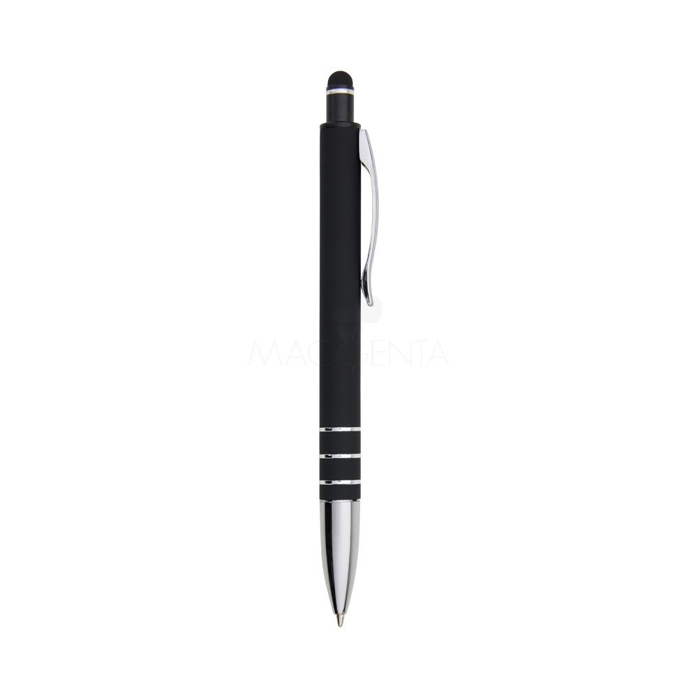 Caneta metálica touchscreen com acabamento emborrachado, acionamento por clique e carga esferográfica azul 1.0mm.