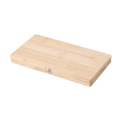 Kit churrasco 4 peças em estojo de madeira. Contém três facas e um garfo.