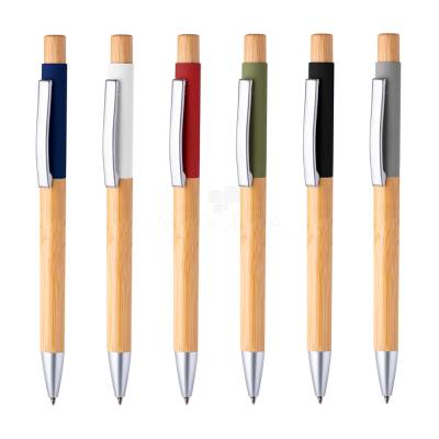 Caneta esferográfica em alumínio reciclável com escrita em azul. Refil parker e acionador e corpo em bambu.