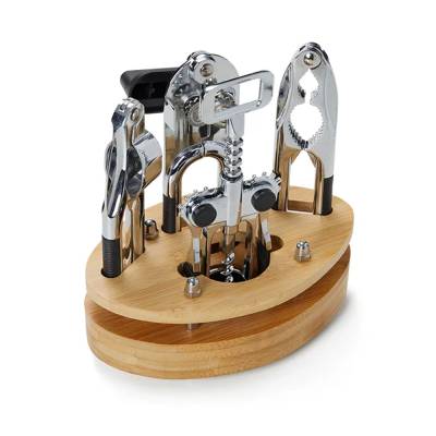 Kit com quatro acessórios úteis para cozinha em metal cromado brilhante com detalhes em plástico texturizado preto nos cabos, sendo um abridor de latas borboleta, um espremedor de alhos, um alicate quebra-nozes, um saca-rolhas de alavanca dupla com espiral e taças de 490 ml para vinho.