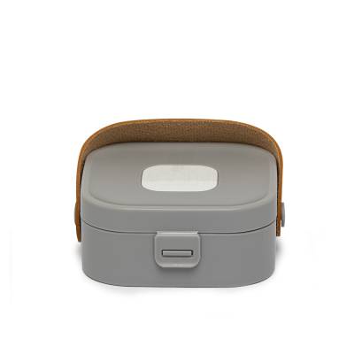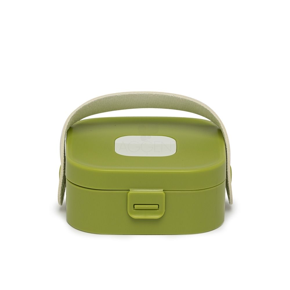 Porta-joias com espelho, produzido em plástico com alça de couro sintético e berço de silicone removível.