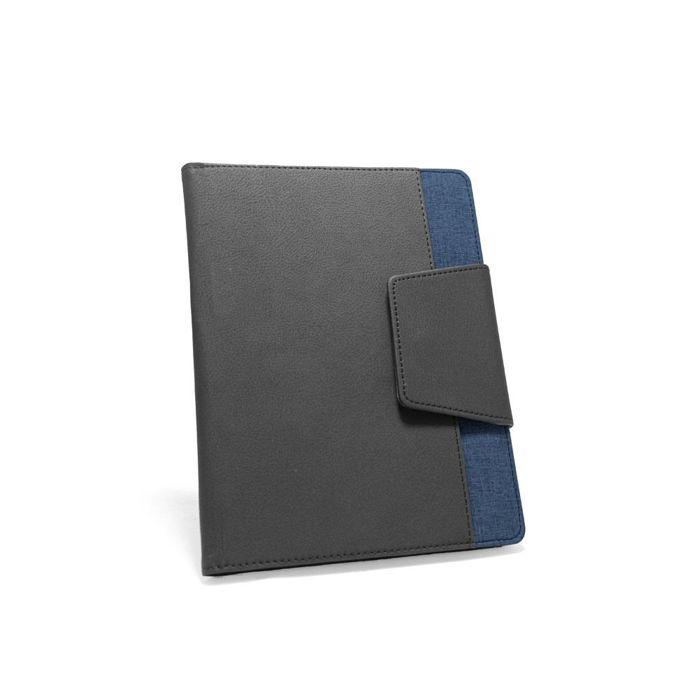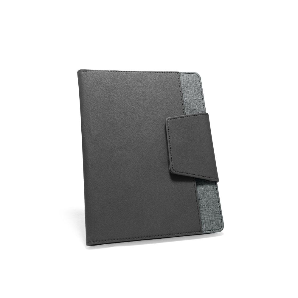 Capa em c. sintético e tecido em poliéster com caderno A5 removível com 80 folhas lisas. Contém fecho magnético, bolso exterior, bolso interior e suporte para esferográfica (não inclusa). Fornecida em embalagem de non-woven.