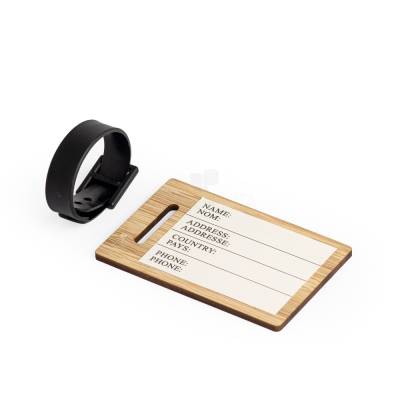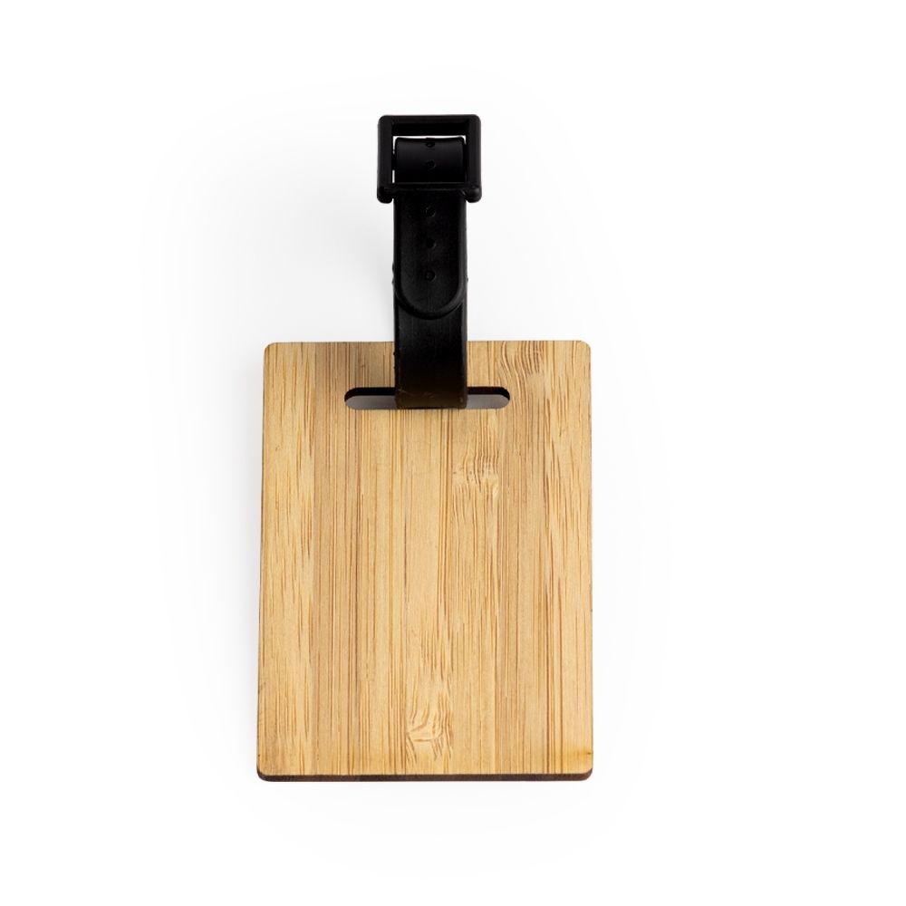 Tag identificador de bagagem em bambu. Parte frontal com área para identificação e verso liso. Possui fivela plástica com dois tamanhos para encaixe.