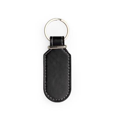 Chaveiro de couro sintético com detalhe em metal e frente e verso lisos.