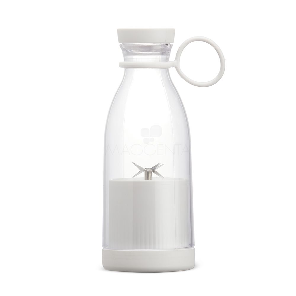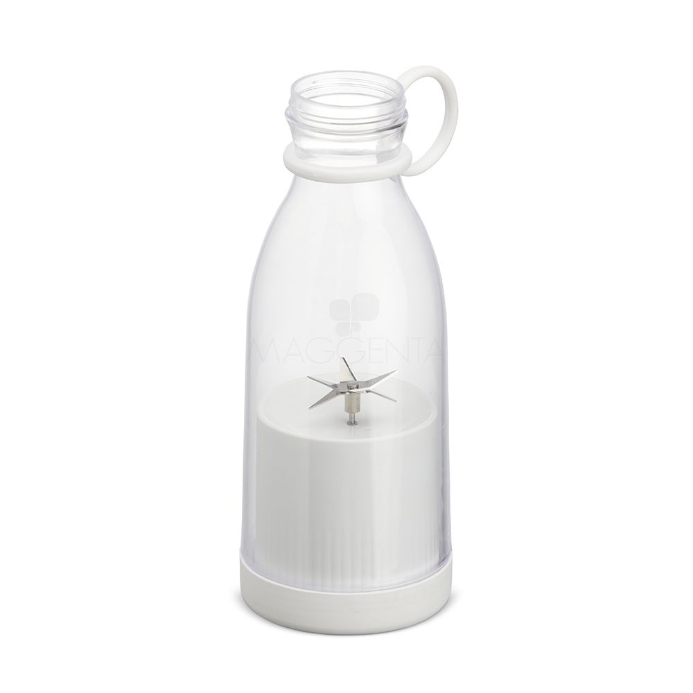 Mini liquidificador portátil com capacidade de 380ml. Contém tampa rosqueável plástica com alça emborrachada para transporte, ventoinha inox 6 lâminas e base plástica com borrachas antiderrapantes. Acompanha cabo USB. Obs. (Para o funcionamento do produto a quantidade total de frutas/água adicionadas não deve exceder 300ml).