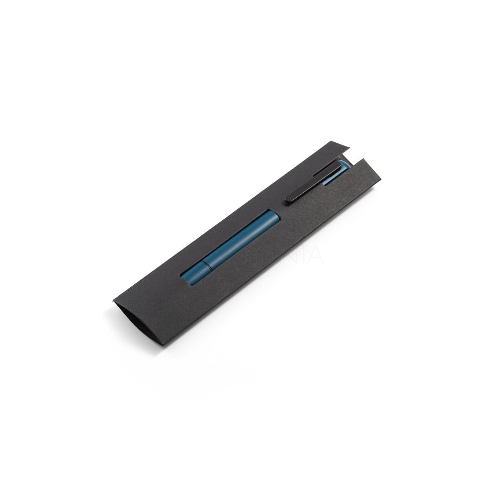 Esferográfica em alumínio 94% reciclado e escrita em azul. Quando personalizado no clipe permite que ao ser rodado ilumine o seu logotipo ou personalização. Fornecida em bolsa de oferta.