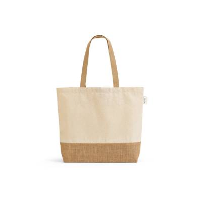 Sacola em 70% algodão reciclado e 30% poliéster reciclado (220 g/m²) com base em juta. Alças em webbing com 65 cm.