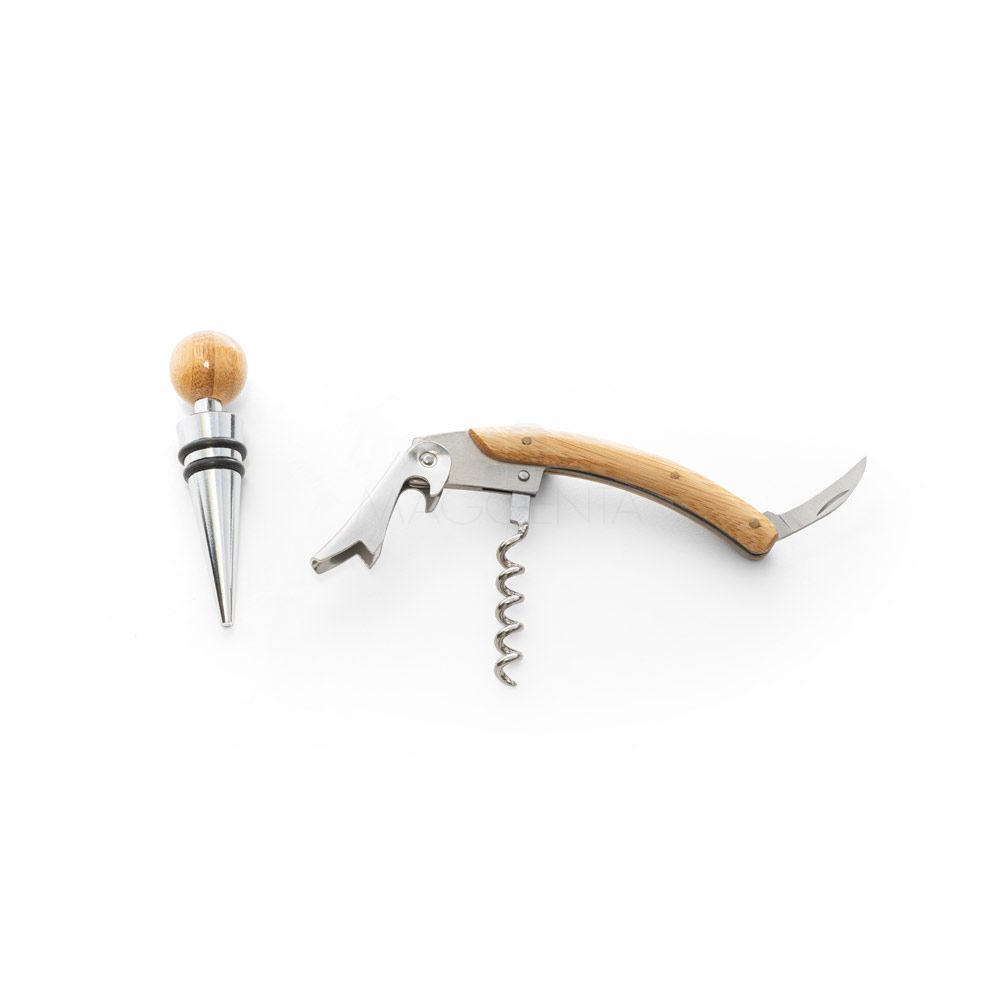Conjunto de vinho com dois componentes em metal e bambu: um saca rolhas e um salva-gotas. Fornecido em caixa presente de papel kraft reciclado. A cor e o resultado da impressão nos materiais naturais pode variar entre produtos.