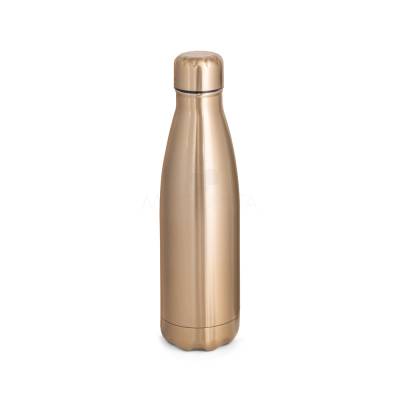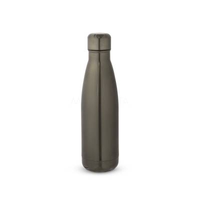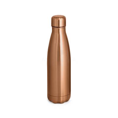 Garrafa em aço inox de parede dupla térmica, isolada a vácuo. Garrafa com acabamento metalizado e tampa em aço inox. Todas as componentes da garrafa - tampa, corpo e base - na mesma cor. Capacidade até 510 mL. Fornecido em caixa presente de papel kraft. Certificação EU Food Grade.
