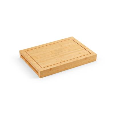 Conjunto de tábuas em bambu com 3 facas inclusas. Composto por duas tábuas: a tábua exterior e a tábua interior que assume duas funcionalidades - um compartimento para três facas inclusas (faca de legumes, faca de pão, faca de cozinha) e como tábua de corte. Fornecida em caixa presente em papel kraft reciclado. Certificação EU Food Grade. A cor e o resultado da impressão nos materiais naturais pode variar entre produtos.
