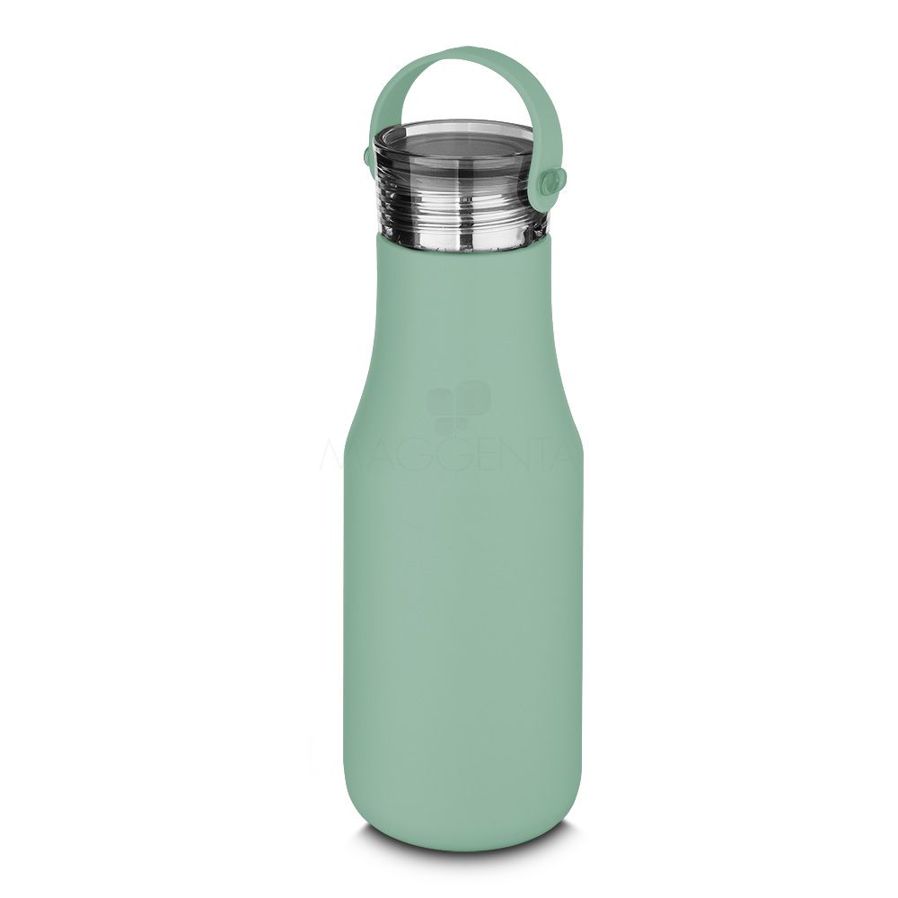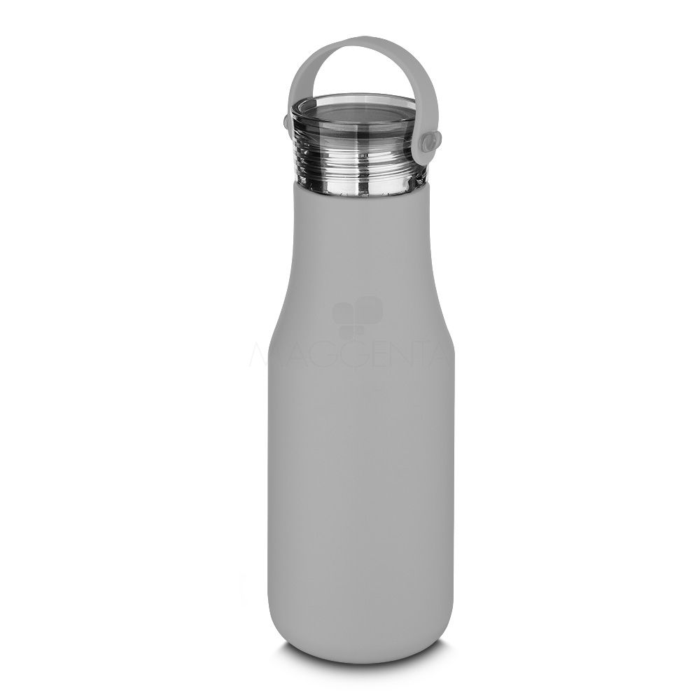 Garrafa térmica em aço inox com parede dupla com capacidade de até 500 ml. Tampa plástica rosqueável, alça em silicone e anel de silicone para vedação.