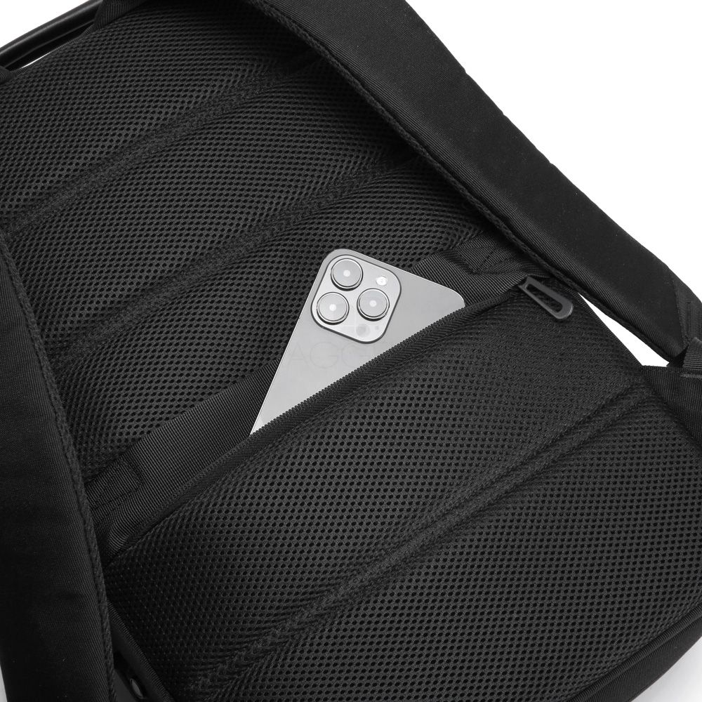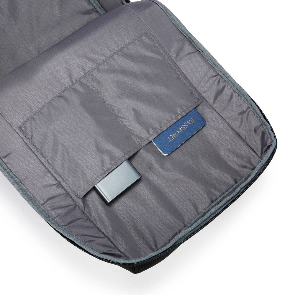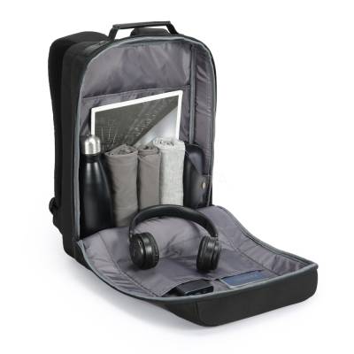 Mochila premium, produzida com poliéster acolchoado, alças de ombro acolchoadas, interior com divisórias, bolso frontal com zíper e na parte das costas uma divisória atrás do engate para mala de viagem, aceita notebook de até 15,6”.