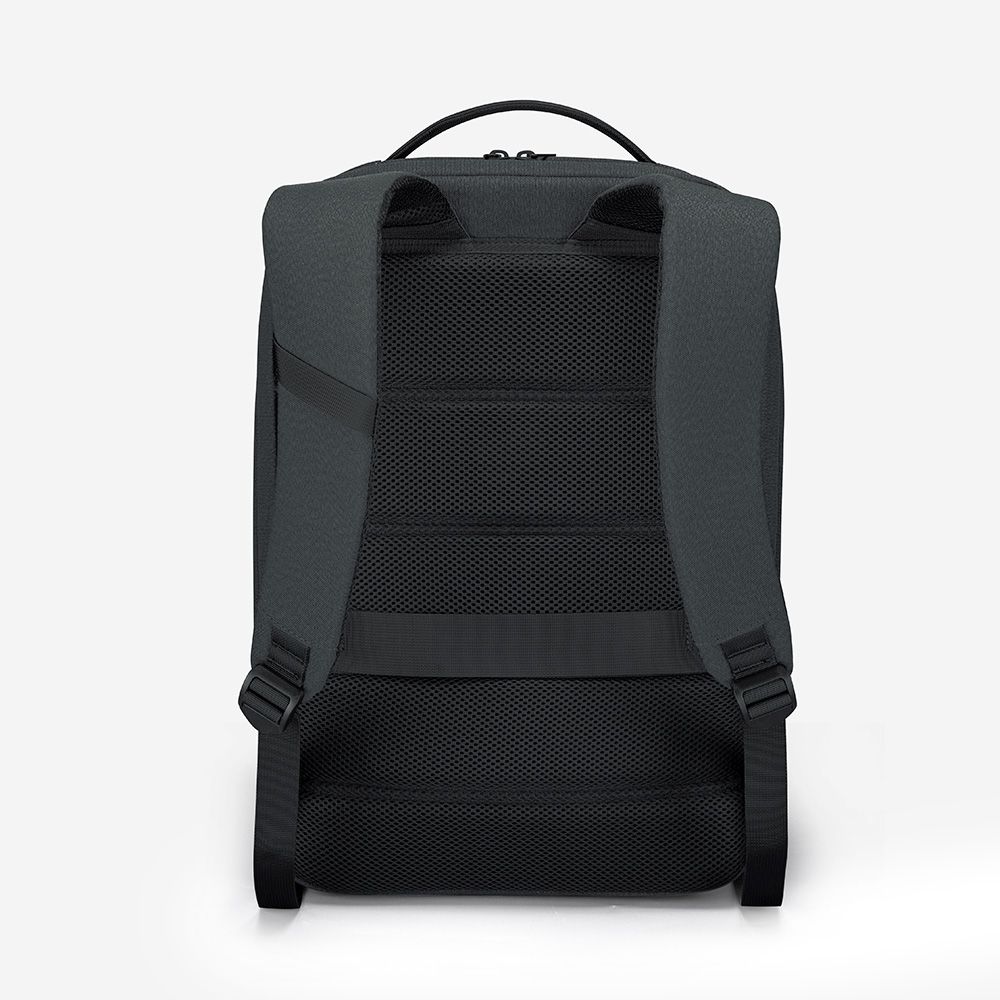 Mochila premium, produzida com poliéster acolchoado, alças de ombro acolchoadas, interior com divisórias com zíper para acomodar pequenos objetos, bolso frontal com zíper e na parte das costas uma divisória atrás, com engate para mala de viagem, aceita notebook de até 15,6”, porta USB na lateral.