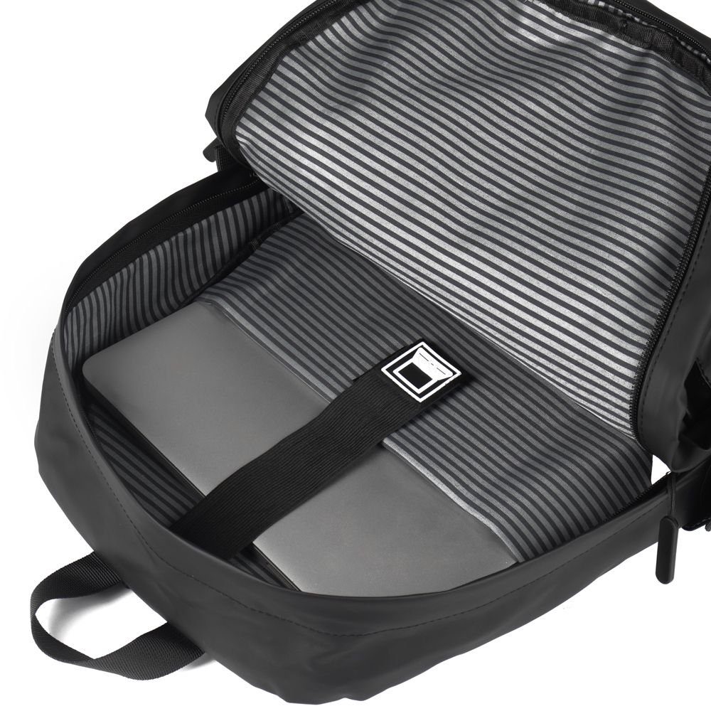 Mochila p/ Notebook em PU com compartimento para notebook de até 15,6", alça de mão e ombro acolchoada, engate para mala de viagem, bolso frontal e laterais.